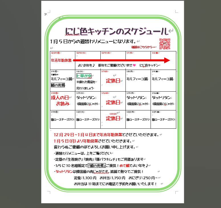 本来は1月7日ではありますが定休日なので6日に「七草がゆ」をご用意させていただきます。お正月の胃袋休ませてくださいね。
