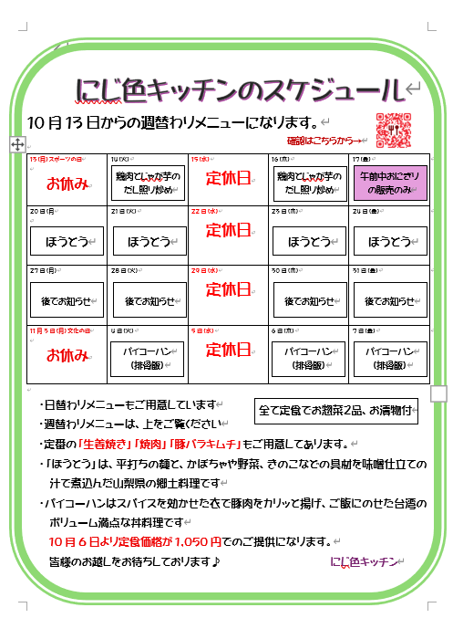 【お知らせ】10月13日以降の週替わりメニュースケジュールです