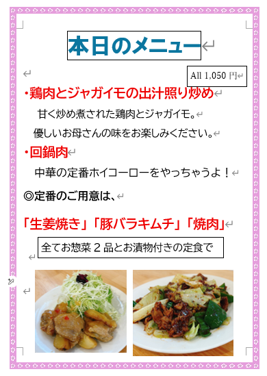 本日の特別メニューは、「回鍋肉(ホイコーロー)」になります。数量限定になります。