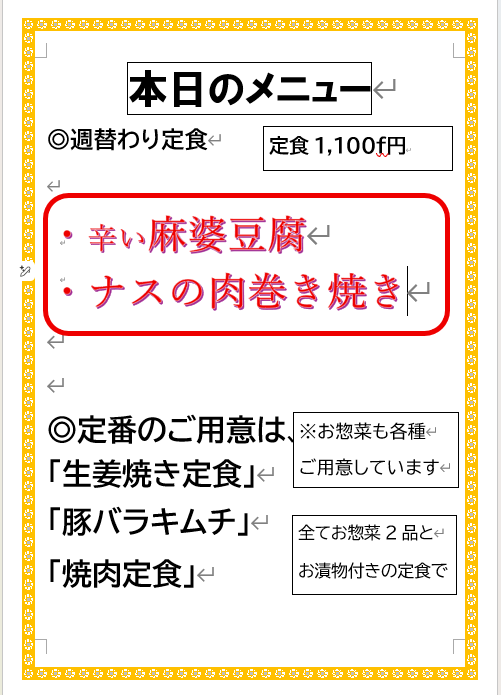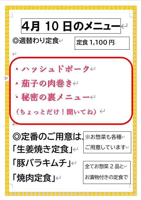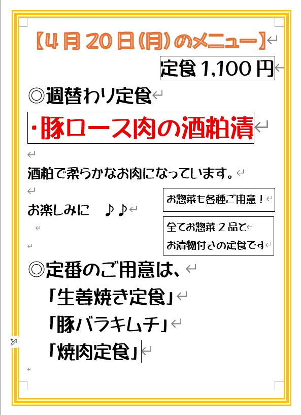 定番メニュー(生姜焼き、焼肉、豚バラキムチ)や汁物でない定食の場合お弁当にできます。