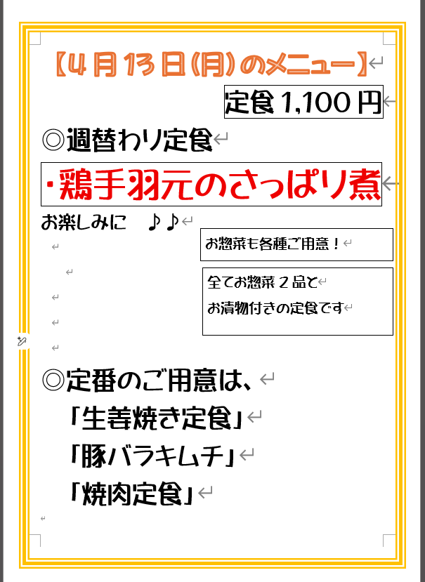 週替わりメニュー、明日からは「鶏手羽元のさっぱり煮」になりますお楽しみに。