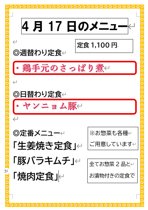 4月17日の週替わりメニューは「鶏手羽元のさっぱり煮」になります。