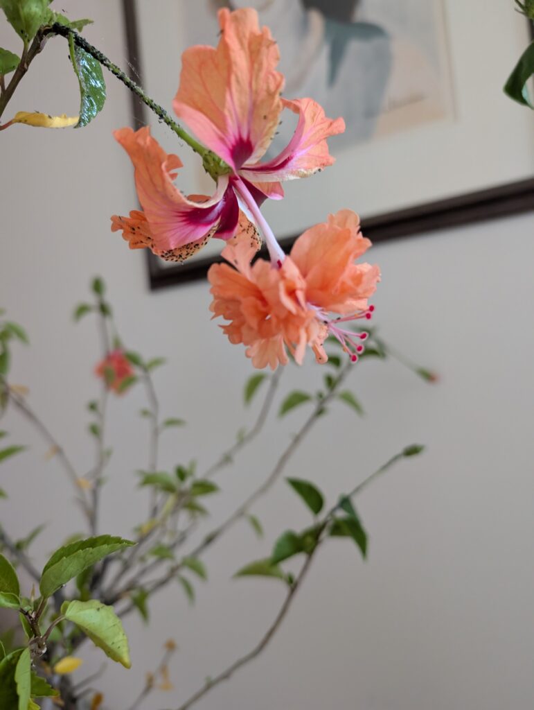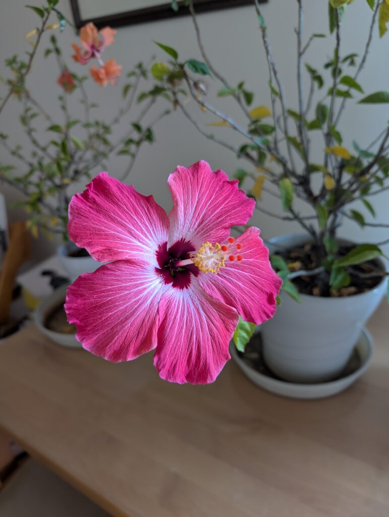 外に出しておいたハイビスカスの鉢を家の中にしまい込みました。そうしたら、なんと花が咲いたじゃないですかぁ~!もしかしたら温かいところに入れて貰って「あれ?夏になったのかな?」なーんて思ったのかしら???